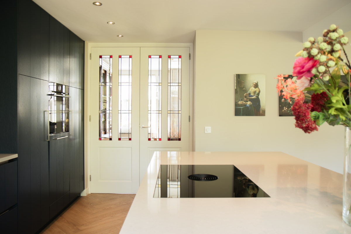 Deze moderne keuken met veel klassieke details laat zien hoe deze twee stijlen perfect gecombineerd kunnen worden. De keuken is gerealiseerd in een donkerblauwe kleur, wat heeft geresulteerd in een sfeervolle keuken die goed past in de ruimte én in combinatie met het glas in lood.
