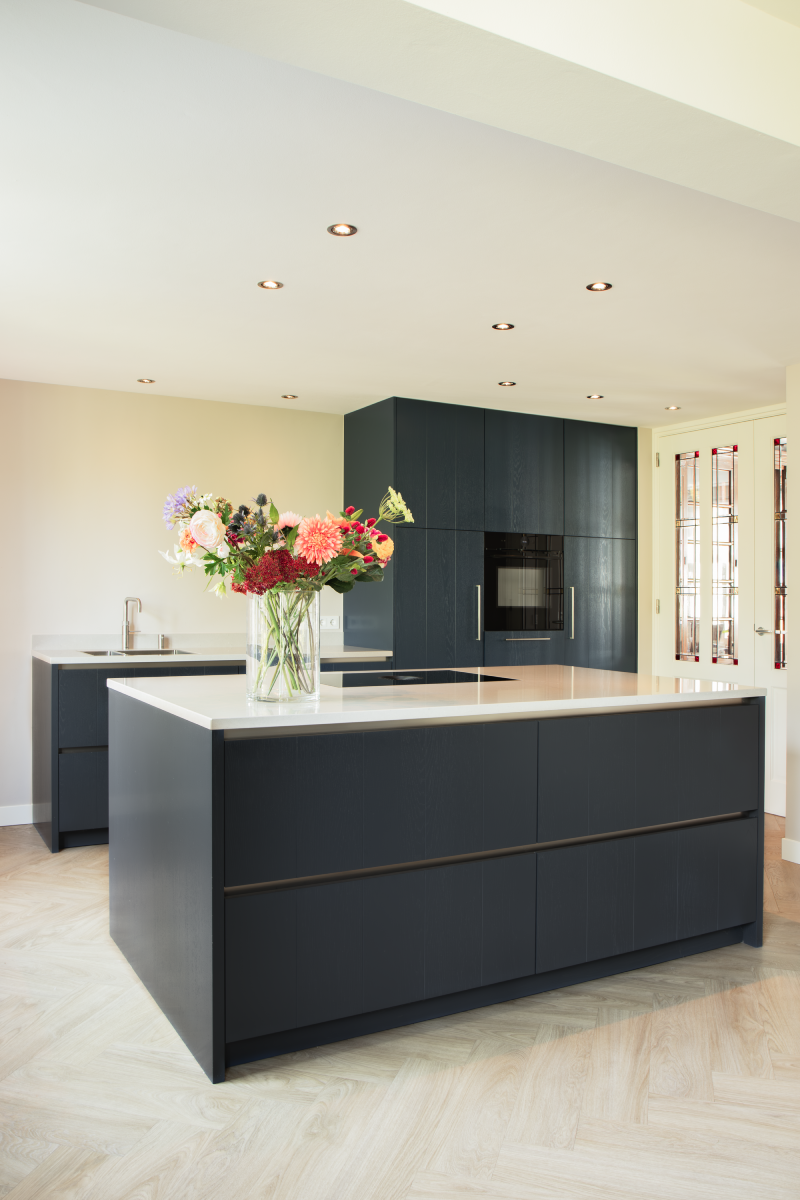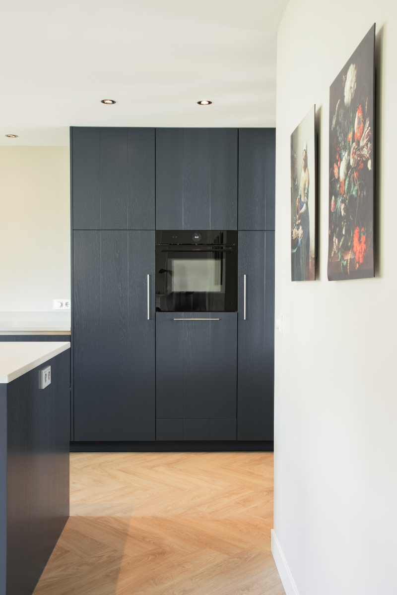 In deze keuken is er gekozen voor Mereno Manchester fronten van eiken fineer geplankt met een groef. Deze fronten zijn vervolgens in een donkerblauwe kleur gespoten om zo de nerven en de groef in het hout te behouden.