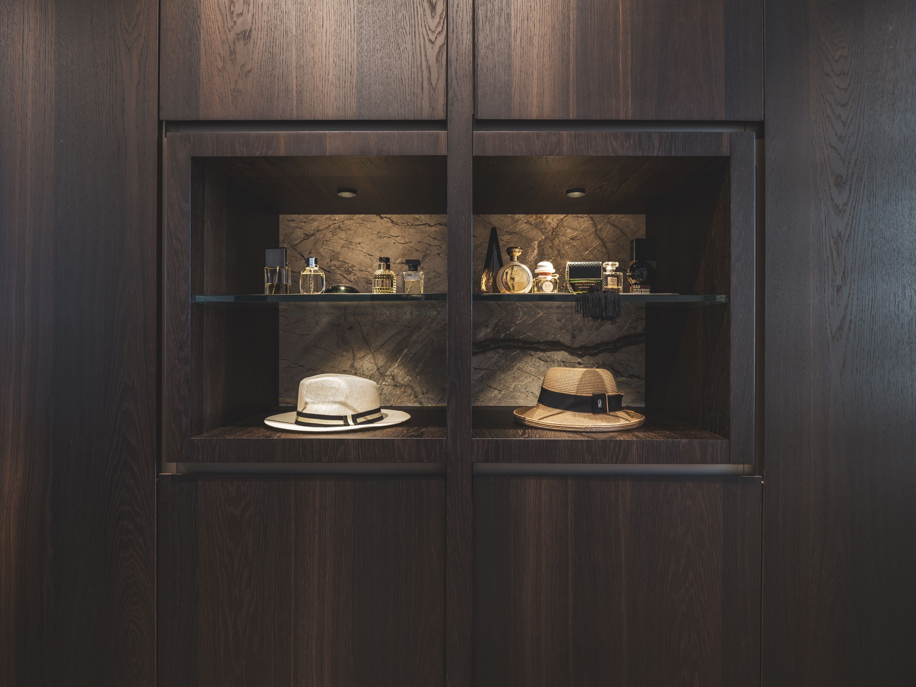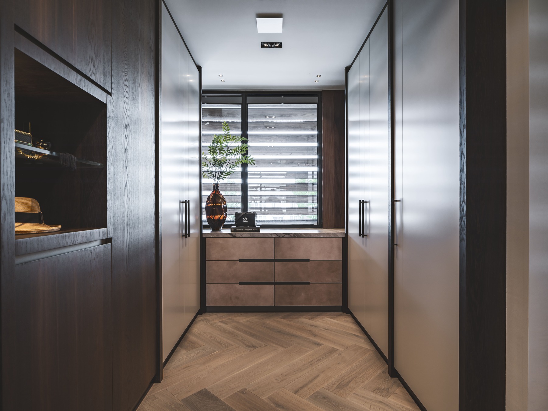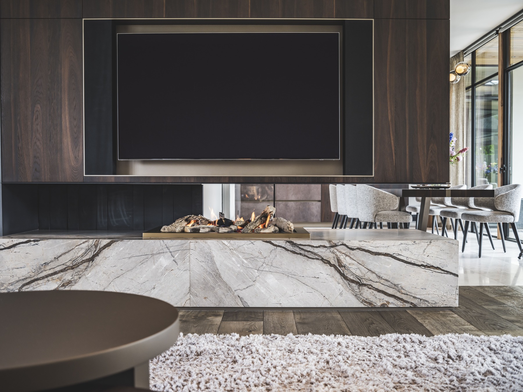 De materialen die in het totaal interieur terug komen zijn gerookt eiken fineer en natuursteen in de kleur Essential Grey. Het donkere fineer gaat perfect gepaard met het lichte natuursteen, waardoor er een prachtig contrast gecreëerd wordt.