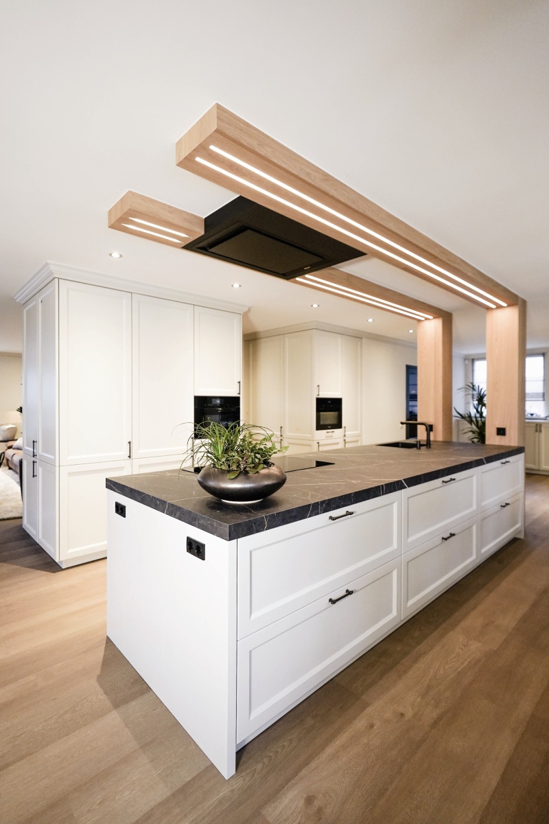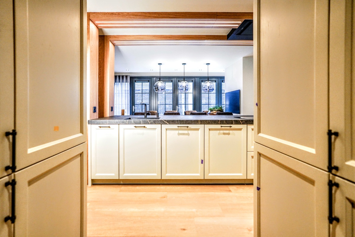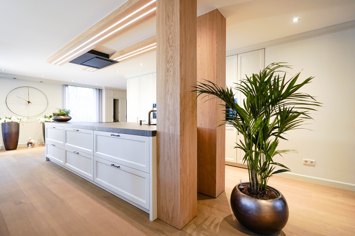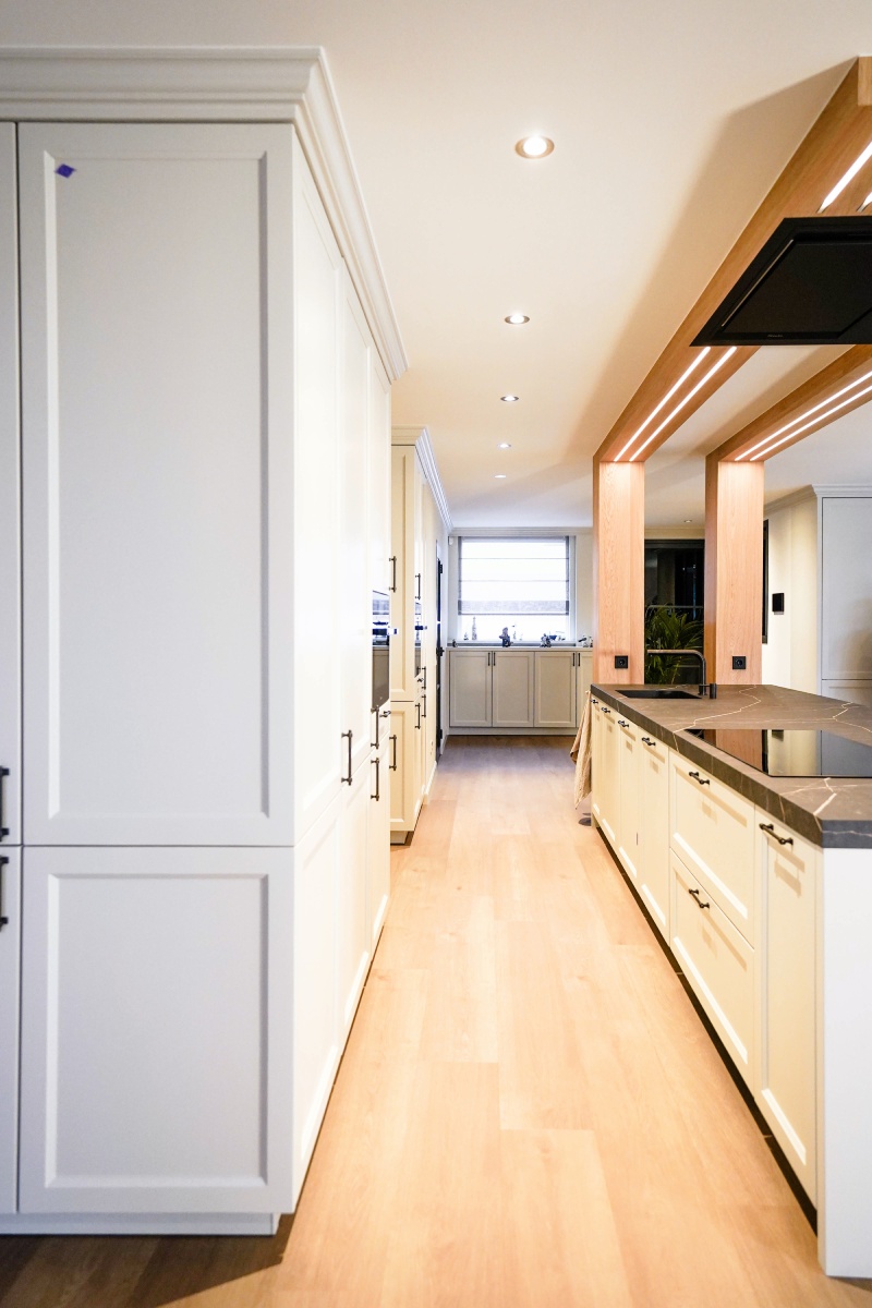 Een keuken, bijkeuken, koffienis, dressoir, tv-meubel en dressoir. Alle kasten zijn boven tegen het plafond voorzien van kroonlijsten, wat toevoegt aan de klassieke stijl van het interieur. De houten stollen met ledverlichting boven het kookeiland zorgen samen met het donkere werkblad voor een moderne uitstraling.