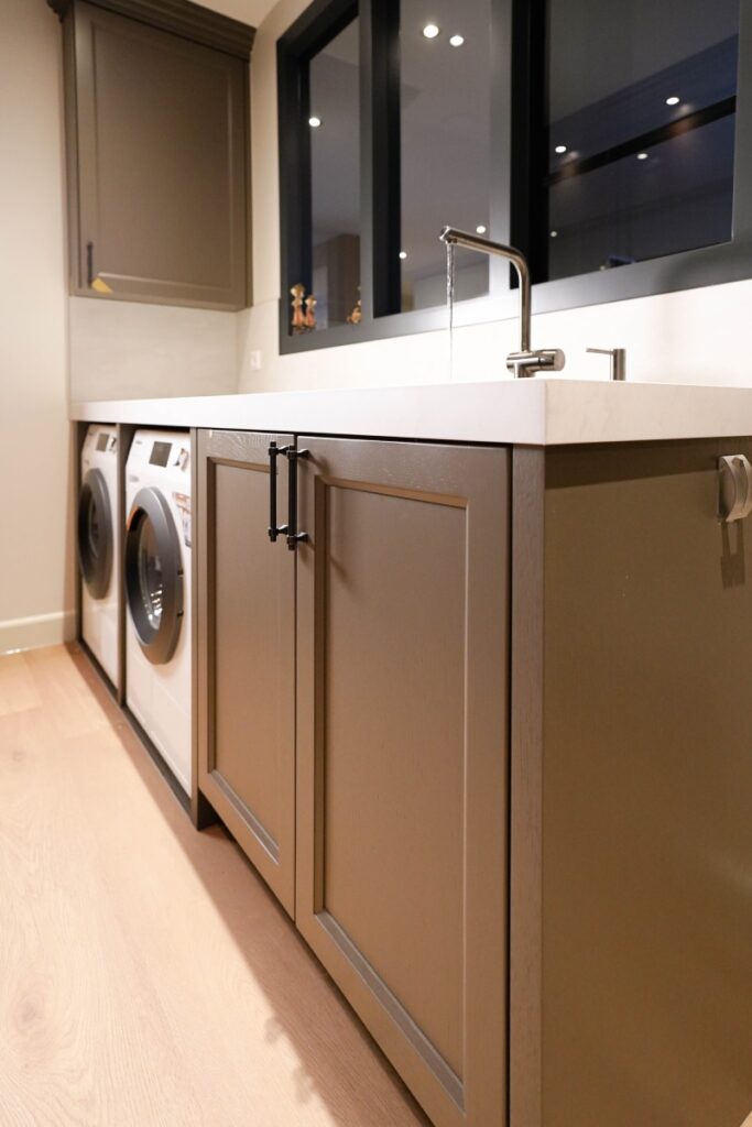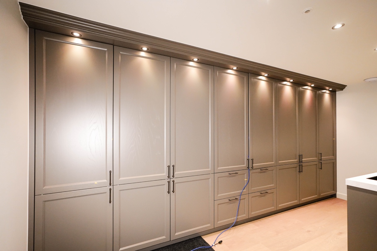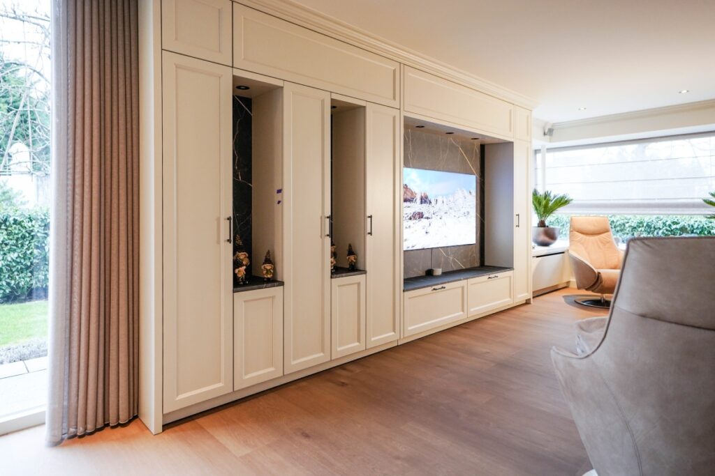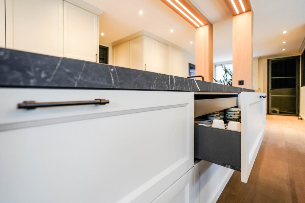 Een keuken, bijkeuken, koffienis, dressoir, tv-meubel en dressoir. Alle kasten zijn boven tegen het plafond voorzien van kroonlijsten, wat toevoegt aan de klassieke stijl van het interieur. De houten stollen met ledverlichting boven het kookeiland zorgen samen met het donkere werkblad voor een moderne uitstraling.
