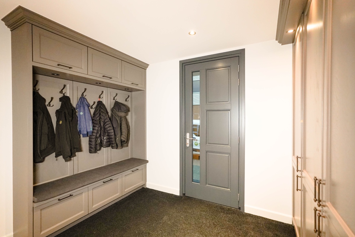 Voor zowel de keuken als de rest van het interieur is er gekozen voor de Mereno Bretagne fronten van massief eiken ongenoest. In de keuken, koffiehoek, dressoir en tv-kast zijn deze klassieke fronten gerealiseerd in een witte kleur met een matte afwerking. In de bijkeuken en garderobe is er gekozen voor een kleur van Little Green. In de keuken zitten de verticale stollen om kolommen heen, welke over het plafond horizontaal doorlopen over het kookeiland. Deze stollen zijn gerealiseerd in gefineerd eiken geplankt.