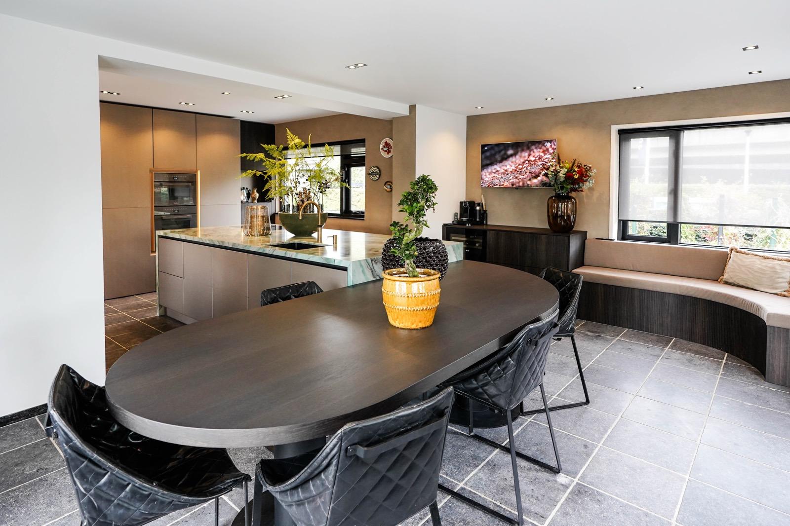 Grote leefkeuken met kookeiland, grote eettafel, hoge kastenwand, bar, ronde zitbank en geïntegreerde verlichting. Alles op maat gemaakt waardoor het perfect past in de ruimte. Er is gekozen voor verschillende fronten, kleuren en materialen waarbij deze keuzes echt voor een sfeervolle eet- en woonruimte zorgen.