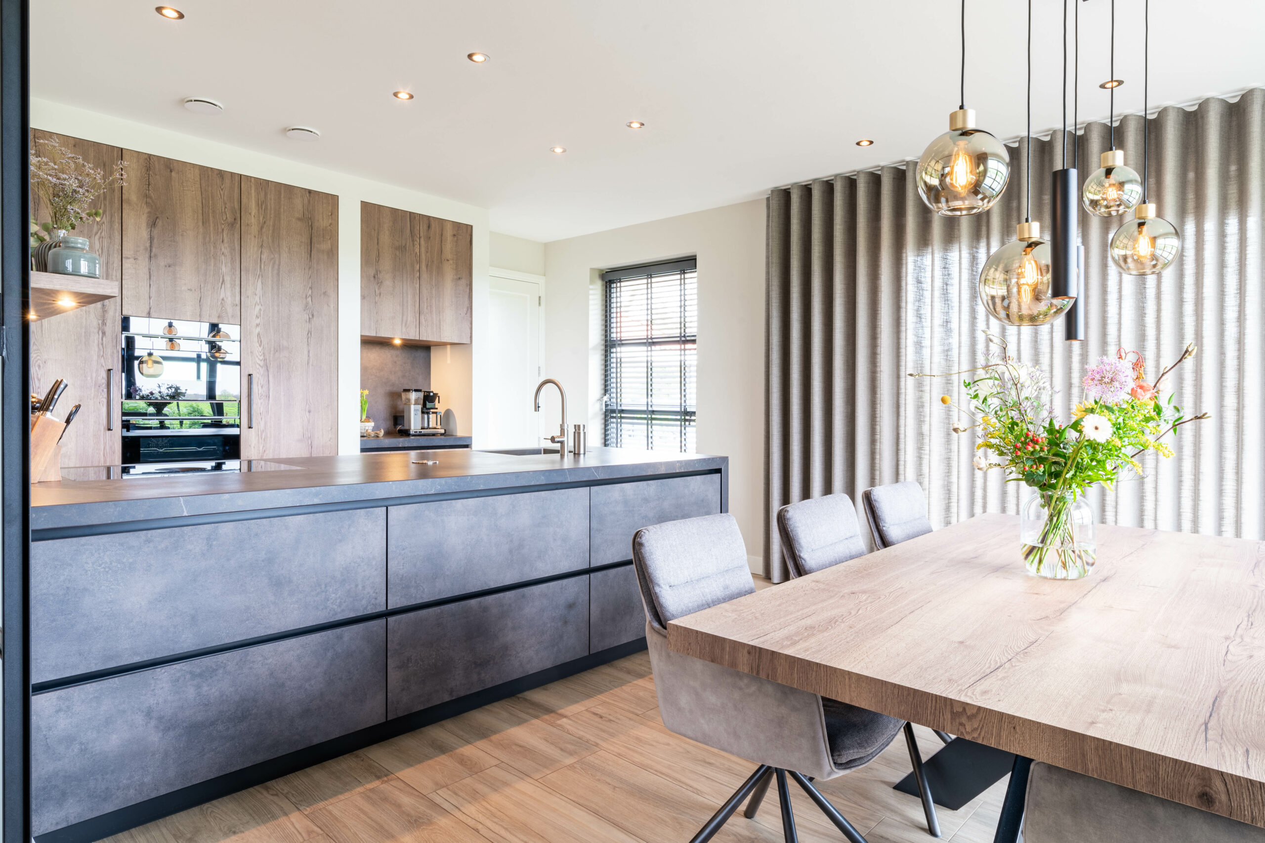 Deze ruime keuken is voorzien van materialen die echt de natuur naar binnen halen. Zo zijn beide verschillende fronten in deze keuken voorzien van een afwerking met een natuurlijke uitstraling en heeft het werkblad ook een natuurstenen look. Door deze natuurlijke tinten krijgt de keuken een robuuste maar tegelijkertijd een moderne uitvoering.