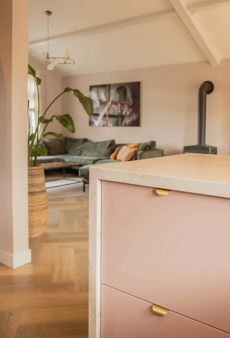 De roze kleur in deze Mereno Milano keuken brengt warmte en sfeer in de woning. Deze warme roze kleur gaat perfect gepaard met het witte werkblad met goudbruine aders én de gouden grepen die door de klant persoonlijk geselecteerd zijn. Door deze combinatie krijgt de keuken een warme maar tegelijkertijd moderne uitstraling.